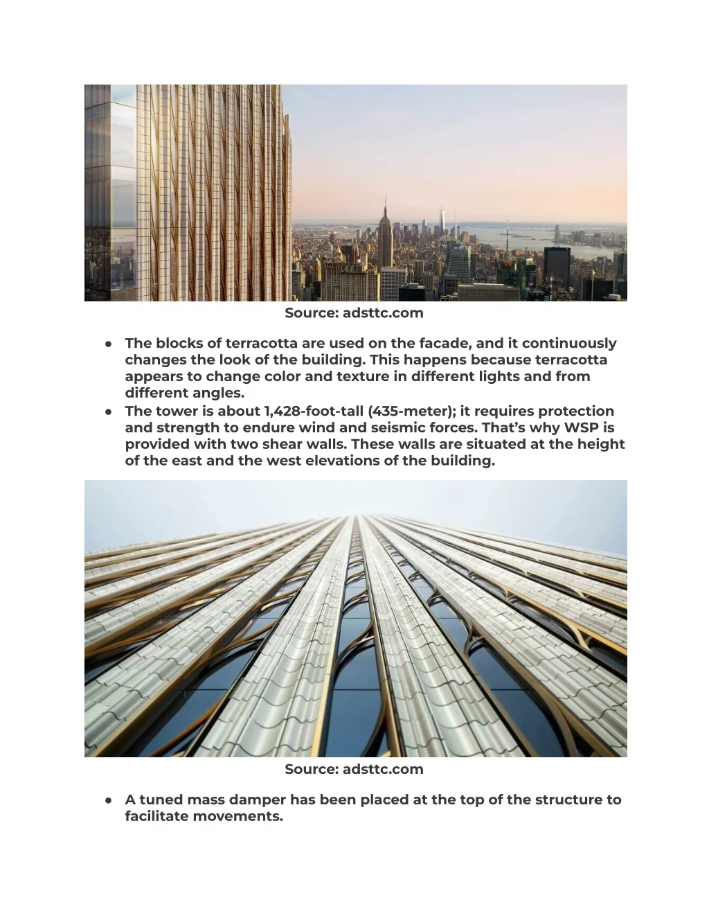 The architecture firm said it drew inspiration from “the golden age of the Manhattan skyscraper” and New York’s Art Deco history. Source: googleusercontent.com Here are some more architectural details about the building: ● The top of the buildings consists of a 300-foot decorative steel crown. ● The tower has small steps, and each one is marked by a solid terracotta pilaster. ● Steps are also covered with a curving bronze filigree that helps people to climb the building.