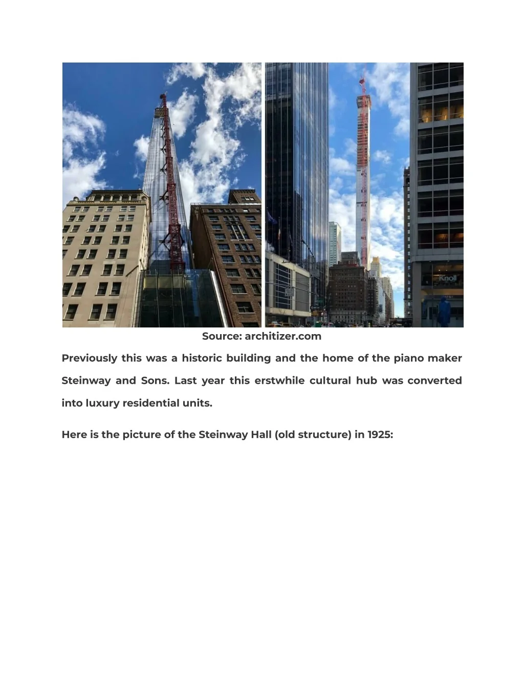 Source: architizer.com Previously this was a historic building and the home of the piano maker Steinway and Sons. Last year this erstwhile cultural hub was converted into luxury residential units. Here is the picture of the Steinway Hall (old structure) in 1925: