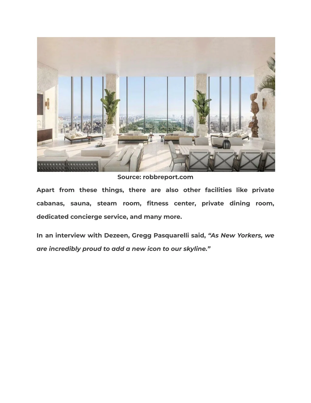 Source: robbreport.com Apart from these things, there are also other facilities like private cabanas, sauna, steam room, fitness center, private dining room, dedicated concierge service, and many more. In an interview with Dezeen, Gregg Pasquarelli said, “As New Yorkers, we are incredibly proud to add a new icon to our skyline.”