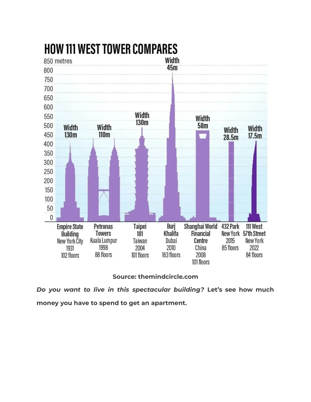 Apartment Cost in World’s Skinniest Skyscraper Yes, it’s true that finally, architects and designers give permission to the public to buy the residential units in this pencil tower. So how much do you need to pay? Honestly, only the building is skinny, not the prices! You can get a studio apartment at a minimum cost of $7.75 million and a penthouse at $66 million. Here’s what the apartment looks like from the inside:
