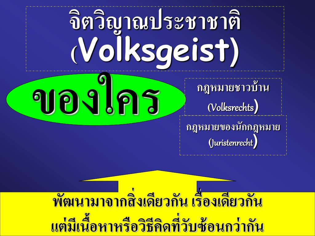 จิตวิญาณประชาชาติ(Volksgeist)จิตวิญาณประชาชาติ(Volksgeist) ของใคร กฎหมายชาวบ้าน(Volksrechts) กฎหมายของนักกฎหมาย(Juristenrecht) พัฒนามาจากสิ่งเดียวกัน เรื่องเดียวกัน แต่มีเนื้อหาหรือวิธีคิดที่วับซ้อนกว่ากัน