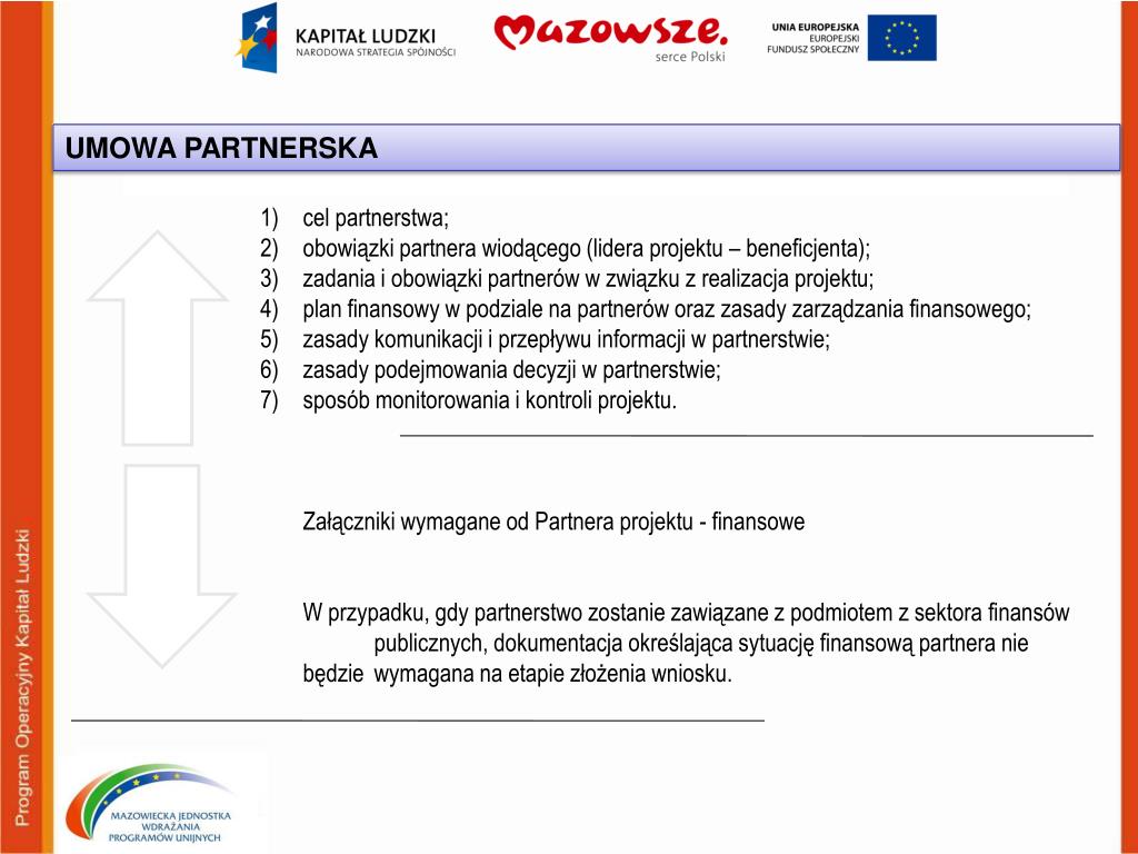 UMOWA PARTNERSKA cel partnerstwa; obowiązki partnera wiodącego (lidera projektu – beneficjenta); zadania i obowiązki partnerów w związku z realizacja projektu; plan finansowy w podziale na partnerów oraz zasady zarządzania finansowego; zasady komunikacji i przepływu informacji w partnerstwie; zasady podejmowania decyzji w partnerstwie; sposób monitorowania i kontroli projektu. Załączniki wymagane od Partnera projektu - finansowe W przypadku, gdy partnerstwo zostanie zawiązane z podmiotem z sektora finansów publicznych, dokumentacja określająca sytuację finansową partnera nie będzie wymagana na etapie złożenia wniosku.