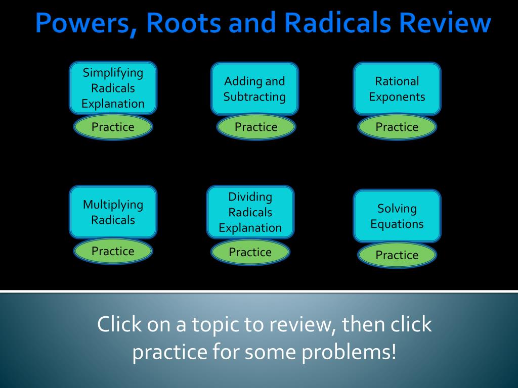 Simplifying Radicals Explanation. Adding and Subtracting. Rational Exponents. Click on a topic to review, then click practice for some problems!. Practice. Practice. Practice. Multiplying Radicals. Dividing Radicals Explanation. Powers, Roots and Radicals Review. Solving Equations.