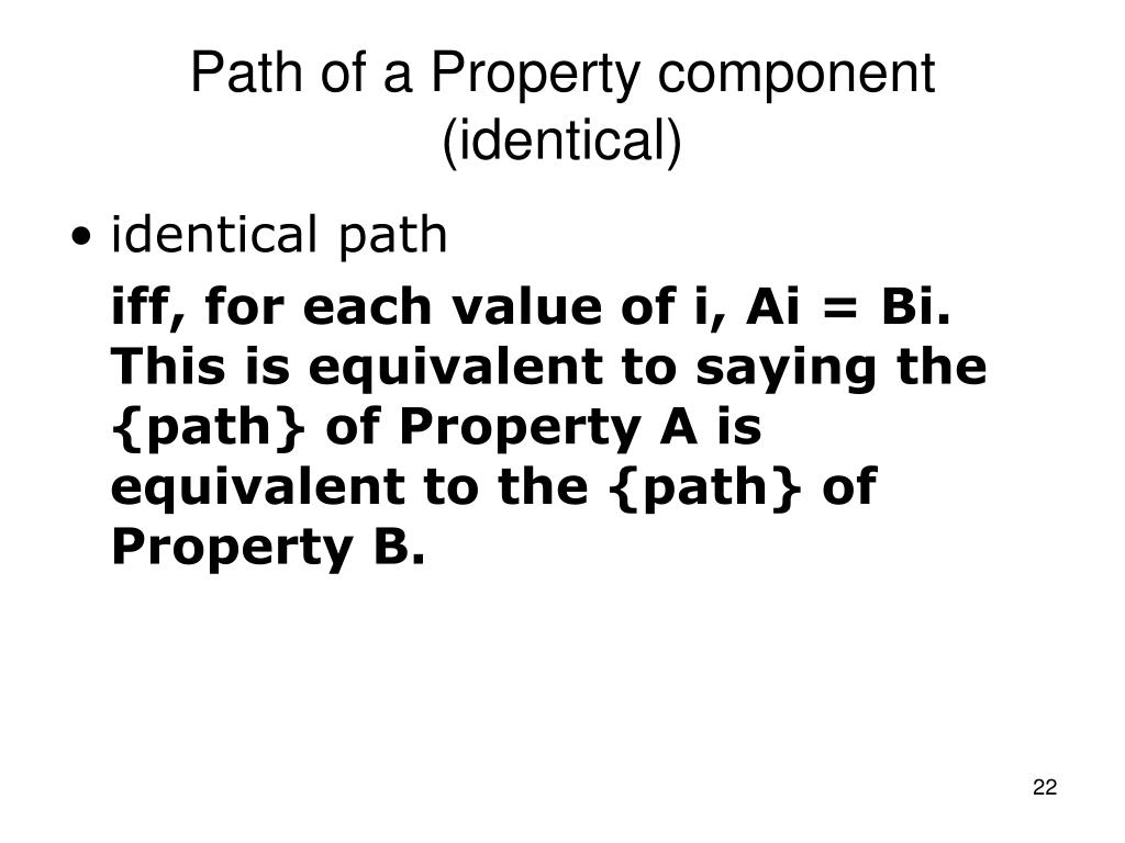 Path of a Property component (identical) • identical path iff, for each value of i, Ai = Bi. This is equivalent to saying the {path} of Property A is equivalent to the {path} of Property B.