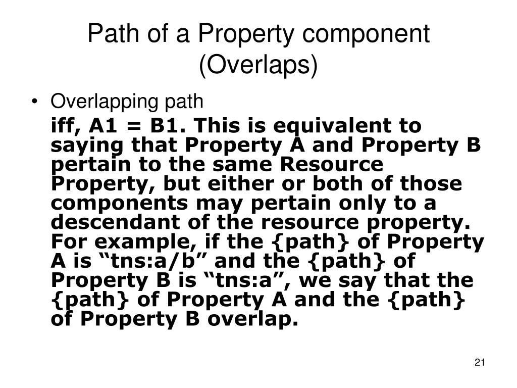 Path of a Property component (Overlaps) • Overlapping path iff, A1 = B1. This is equivalent to saying that Property A and Property B pertain to the same Resource Property, but either or both of those components may pertain only to a descendant of the resource property. For example, if the {path} of Property A is “tns:a/b” and the {path} of Property B is “tns:a”, we say that the {path} of Property A and the {path} of Property B overlap.