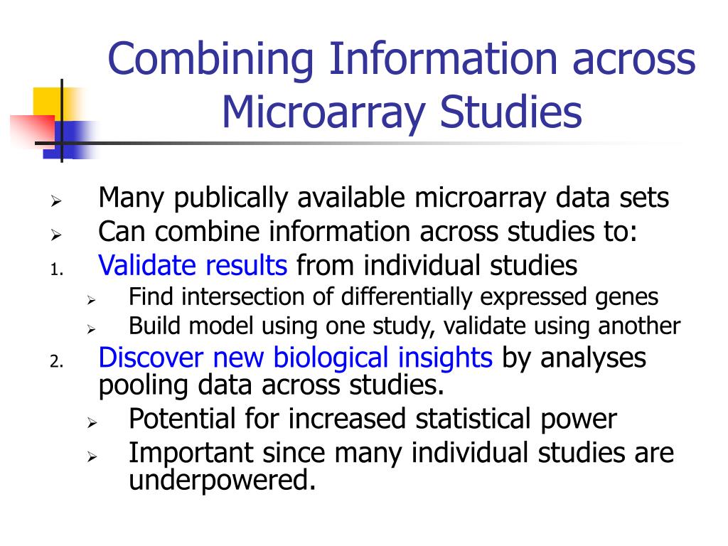 Combining Information across Microarray Studies • Many publically available microarray data sets • Can combine information across studies to: • Validateresults from individual studies • Find intersection of differentially expressed genes • Build model using one study, validate using another • Discover new biological insightsby analyses pooling data across studies. • Potential for increased statistical power • Important since many individual studies are underpowered.