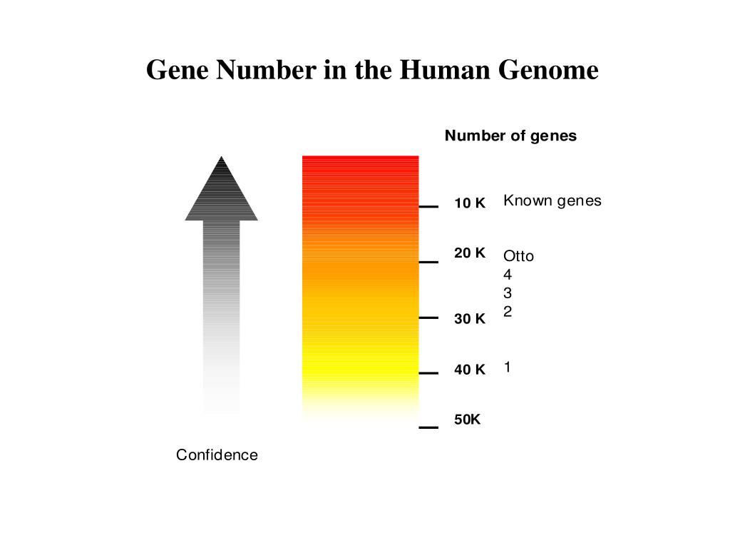The Gene Counting Problem The number probably will be never known exactly. Current estimates: 30,000-40,000 Other estimates: 120,000 • sequence analysis • motif recognition • matches to mRNA • computational predictions • mouse data matches • experimental validation Gene discovery: