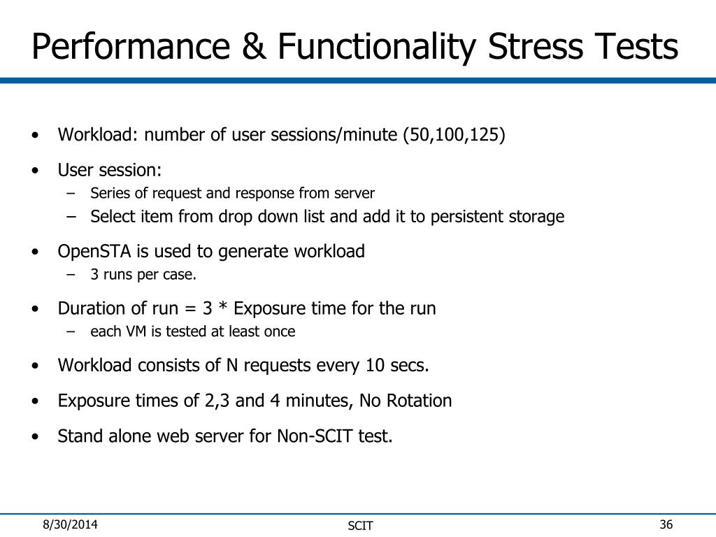 Performance & Functionality Stress Tests • Workload: number of user sessions/minute (50,100,125) • User session: • Series of request and response from server • Select item from drop down list and add it to persistent storage • OpenSTA is used to generate workload • 3 runs per case. • Duration of run = 3 * Exposure time for the run • each VM is tested at least once • Workload consists of N requests every 10 secs. • Exposure times of 2,3 and 4 minutes, No Rotation • Stand alone web server for Non-SCIT test. 8/30/2014 36