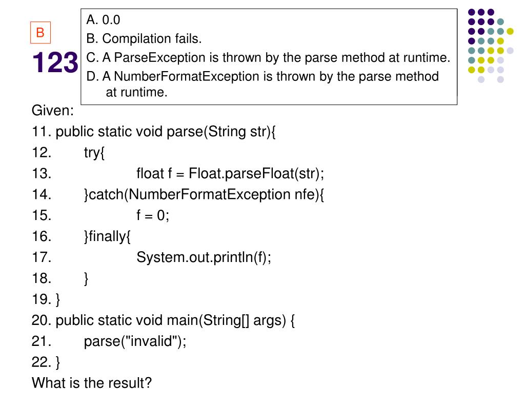 123 A. 0.0 B. Compilation fails. C. A ParseException is thrown by the parse method at runtime. D. A NumberFormatException is thrown by the parse method at runtime. B Given: 11. public static void parse(String str){ 12. try{ 13. float f = Float.parseFloat(str); 14. }catch(NumberFormatException nfe){ 15. f = 0; 16. }finally{ 17. System.out.println(f); 18. } 19. } 20. public static void main(String[] args) { 21. parse("invalid"); 22. } What is the result?