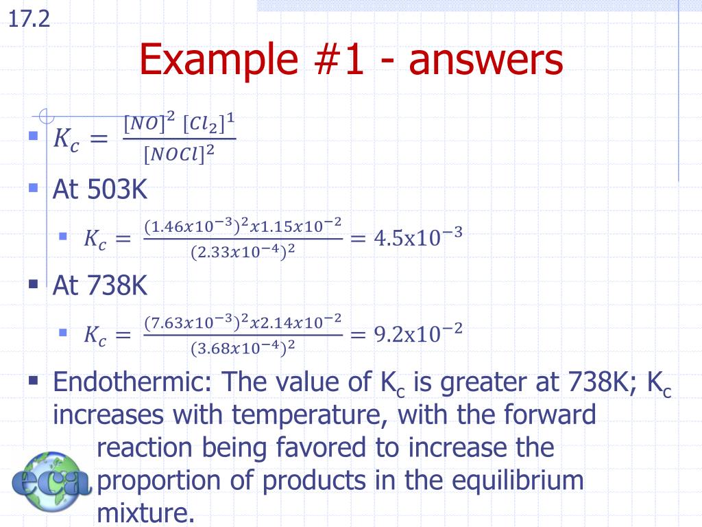 Example #1 - answers • At 503K • At 738K • Endothermic: The value of Kc is greater at 738K; Kc increases with temperature, with the forward reaction being favored to increase the proportion of products in the equilibrium mixture.