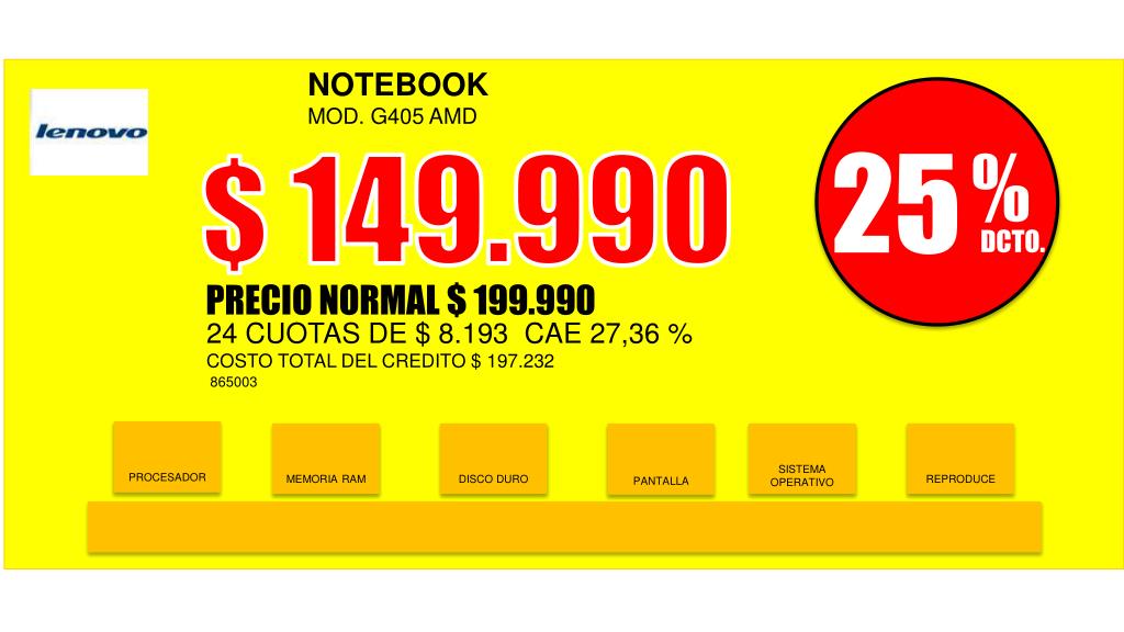 NOTEBOOK MOD. G405 AMD 25 % $ 149.990 DCTO. PRECIO NORMAL $ 199.990 24 CUOTAS DE $ 8.193 CAE 27,36 % COSTO TOTAL DEL CREDITO $ 197.232 865003 SISTEMA OPERATIVO PROCESADOR MEMORIA RAM DISCO DURO REPRODUCE PANTALLA