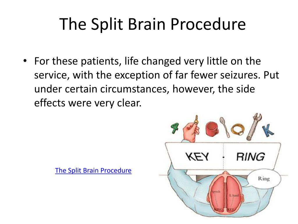 The Split Brain Procedure The Split Brain Procedure For these patients, life changed very little on the service, with the exception of far fewer seizures. Put under certain circumstances, however, the side effects were very clear.
