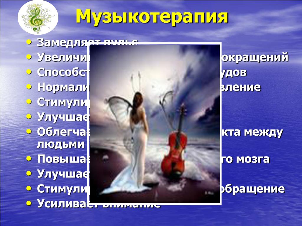 Музыкотерапия • Замедляет пульс • Увеличивает силу сердечных сокращений • Способствует расширению сосудов • Нормализует артериальное давление • Стимулирует пищеварение • Улучшает аппетит • Облегчает установление контакта между людьми • Повышает тонус коры головного мозга • Улучшает обмен веществ • Стимулирует дыхание и кровообращение • Усиливает внимание