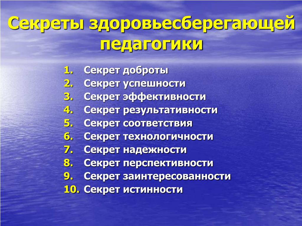 Секреты здоровьесберегающей педагогики • Секрет доброты • Секрет успешности • Секрет эффективности • Секрет результативности • Секрет соответствия • Секрет технологичности • Секрет надежности • Секрет перспективности • Секрет заинтересованности • Секрет истинности