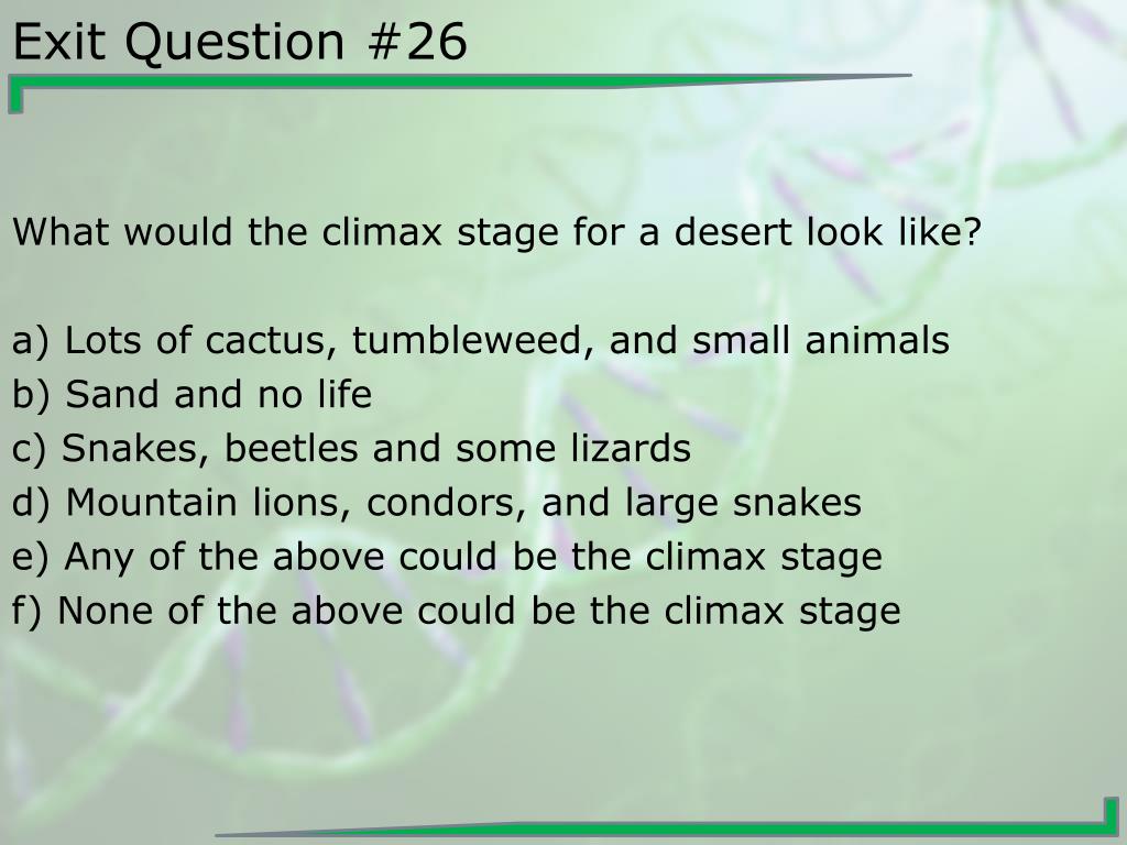 Exit Question #26 What would the climax stage for a desert look like? a) Lots of cactus, tumbleweed, and small animals b) Sand and no life c) Snakes, beetles and some lizards d) Mountain lions, condors, and large snakes e) Any of the above could be the climax stage f) None of the above could be the climax stage