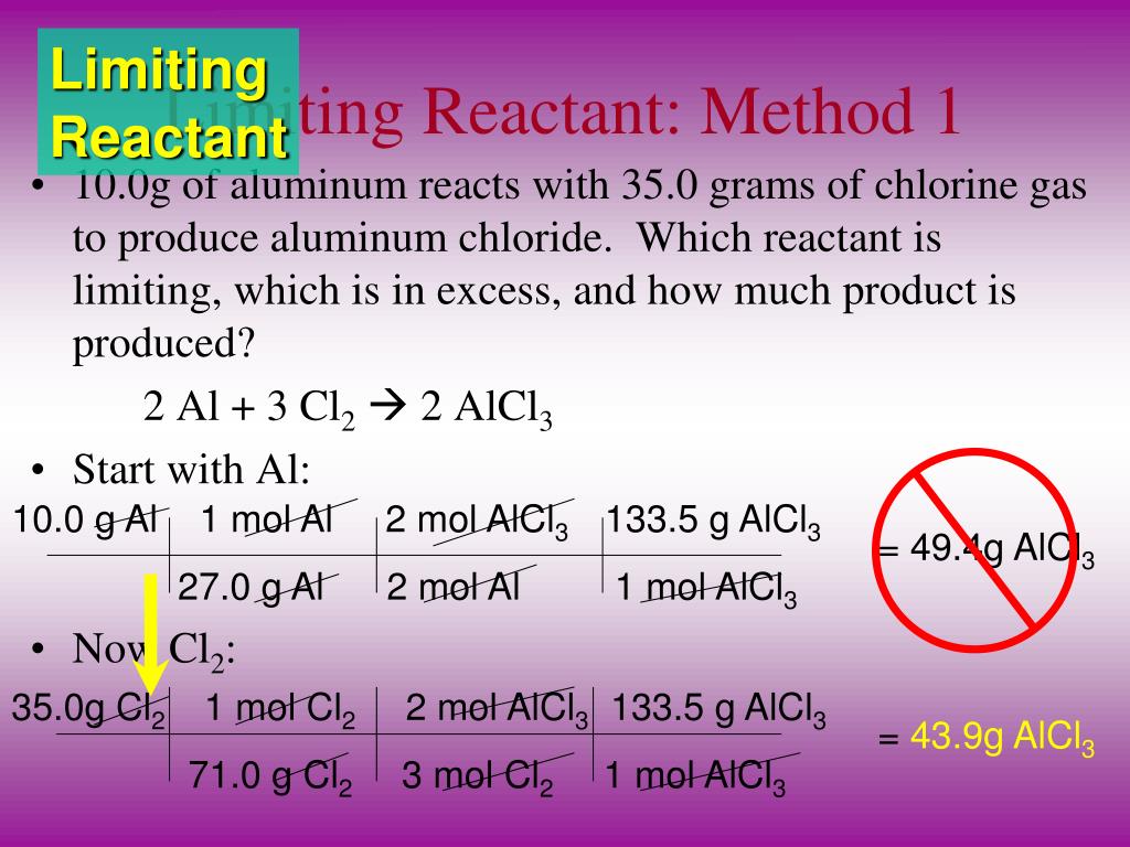 LimitingReactant Limiting Reactant: Method 1 • 10.0g of aluminum reacts with 35.0 grams of chlorine gas to produce aluminum chloride. Which reactant is limiting, which is in excess, and how much product is produced? 2 Al + 3 Cl2 2 AlCl3 • Start with Al: • Now Cl2: 10.0 g Al 1 mol Al 2 mol AlCl3 133.5 g AlCl3 27.0 g Al 2 mol Al 1 mol AlCl3 = 49.4g AlCl3 35.0g Cl2 1 mol Cl2 2 mol AlCl3 133.5 g AlCl3 71.0 g Cl2 3 mol Cl2 1 mol AlCl3 = 43.9g AlCl3