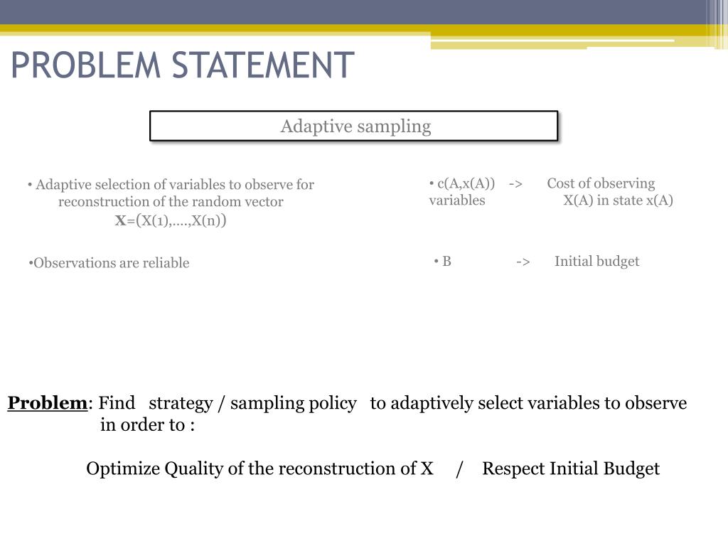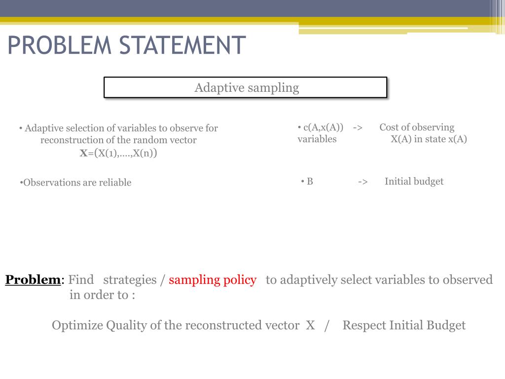 PROBLEM STATEMENT Adaptive sampling • c(A,x(A)) -> Cost of observing variables X(A) in state x(A) • Adaptive selection of variables to observe for reconstruction of the randomvectorX=(X(1),….,X(n)) • B -> Initial budget • Observations are reliable Problem: Findstrategy / samplingpolicy to adaptively select variables to observe in order to : OptimizeQuality of the reconstruction of X / Respect Initial Budget
