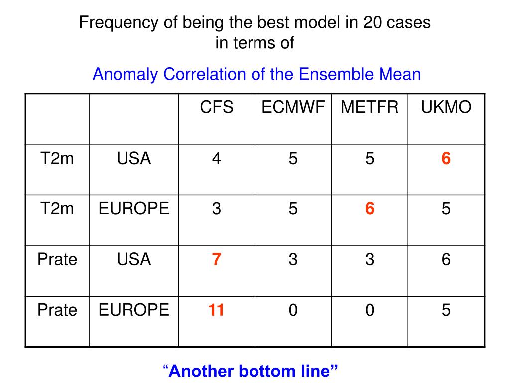 Frequency of being the best model in 20 casesin terms ofAnomaly Correlation of the Ensemble Mean “Another bottom line”