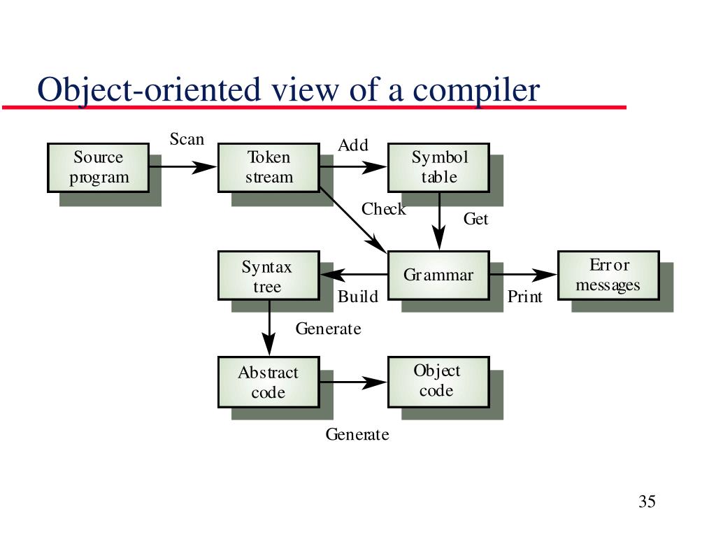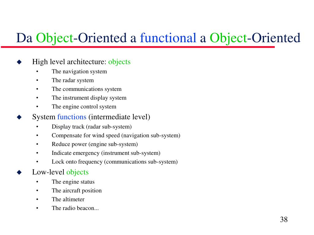 Da Object-Oriented a functional a Object-Oriented • High level architecture: objects • The navigation system • The radar system • The communications system • The instrument display system • The engine control system • System functions (intermediate level) • Display track (radar sub-system) • Compensate for wind speed (navigation sub-system) • Reduce power (engine sub-system) • Indicate emergency (instrument sub-system) • Lock onto frequency (communications sub-system) • Low-level objects • The engine status • The aircraft position • The altimeter • The radio beacon...