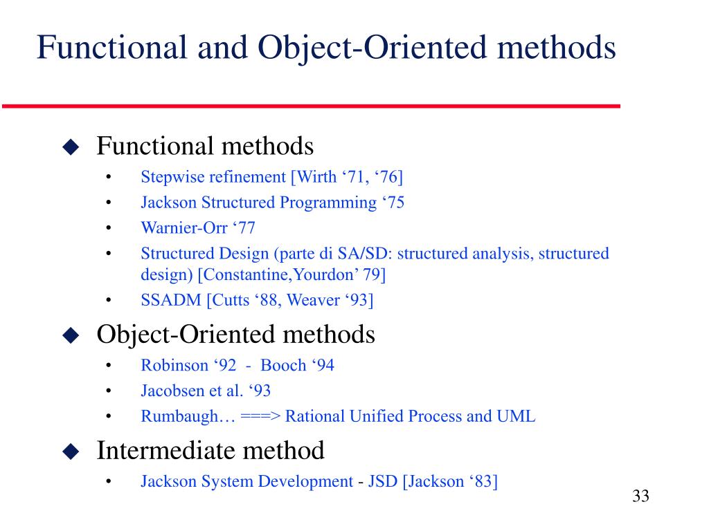 Functional and Object-Oriented methods • Functional methods • Stepwise refinement [Wirth ‘71, ‘76] • Jackson Structured Programming ‘75 • Warnier-Orr ‘77 • Structured Design (parte di SA/SD: structured analysis, structured design) [Constantine,Yourdon’ 79] • SSADM [Cutts ‘88, Weaver ‘93] • Object-Oriented methods • Robinson ‘92 - Booch ‘94 • Jacobsen et al. ‘93 • Rumbaugh… ===> Rational Unified Process and UML • Intermediate method • Jackson System Development - JSD [Jackson ‘83]