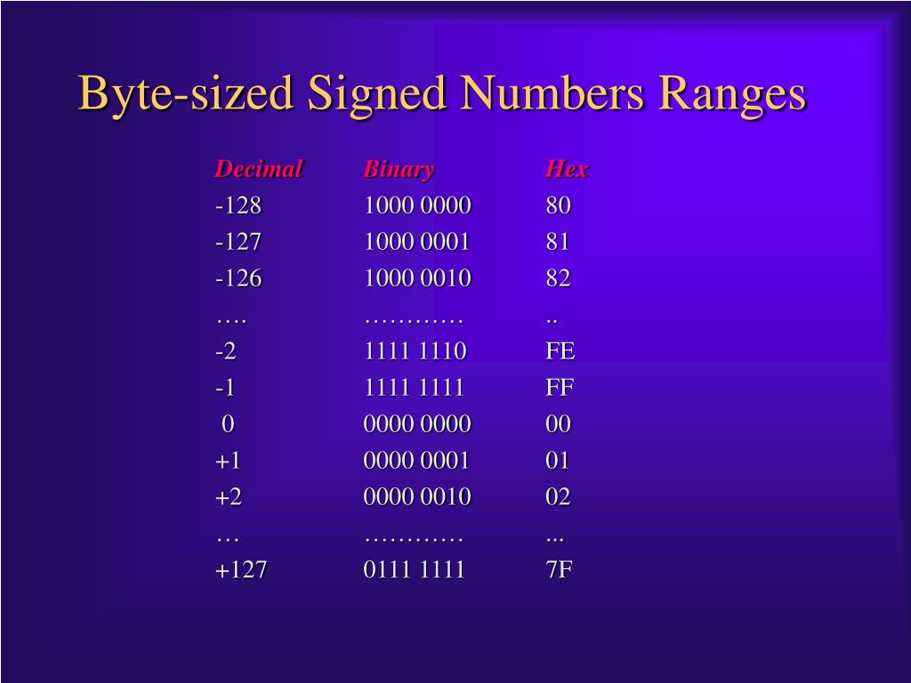 Byte-sized Signed Numbers Ranges Decimal Binary Hex -128 1000 0000 80 -127 1000 0001 81 -126 1000 0010 82 …. ………… .. -2 1111 1110 FE -1 1111 1111 FF 0 0000 0000 00 +1 0000 0001 01 +2 0000 0010 02 … ………… ... +127 0111 1111 7F