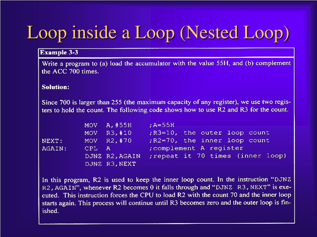 Outlines • Loop instructions • Conditional jump instructions • Conditions determining conditional jump • Unconditional long & short jumps • Calculate target addresses for jumps • Subroutines • Using stack in subroutines • Crystal frequency vs. machine cycle • Code programs to generate time delay
