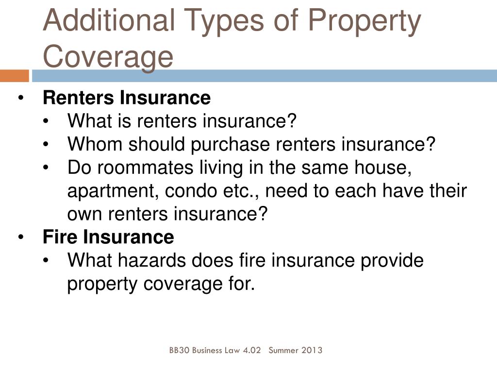 Additional Types of Property Coverage • Renters Insurance • What is renters insurance? • Whom should purchase renters insurance? • Do roommates living in the same house, apartment, condo etc., need to each have their own renters insurance? • Fire Insurance • What hazards does fire insurance provide property coverage for. BB30 Business Law 4.02 Summer 2013