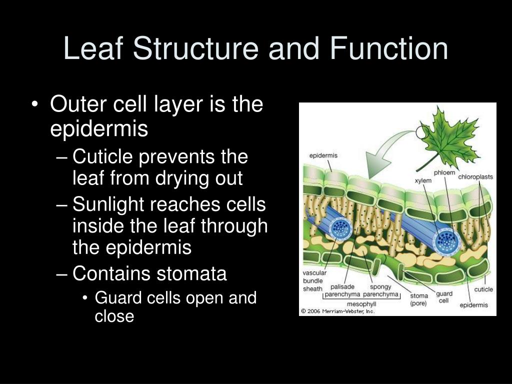 Leaf Structure and Function • Outer cell layer is the epidermis • Cuticle prevents the leaf from drying out • Sunlight reaches cells inside the leaf through the epidermis • Contains stomata • Guard cells open and close