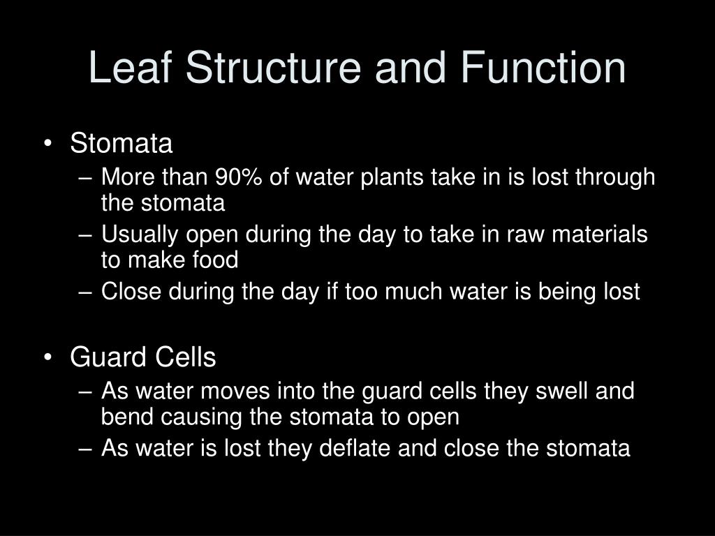 Leaf Structure and Function • Stomata • More than 90% of water plants take in is lost through the stomata • Usually open during the day to take in raw materials to make food • Close during the day if too much water is being lost • Guard Cells • As water moves into the guard cells they swell and bend causing the stomata to open • As water is lost they deflate and close the stomata