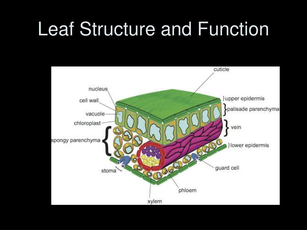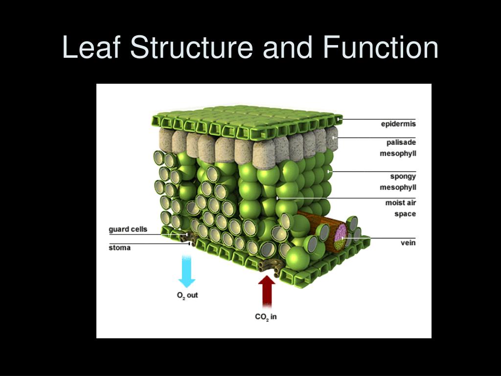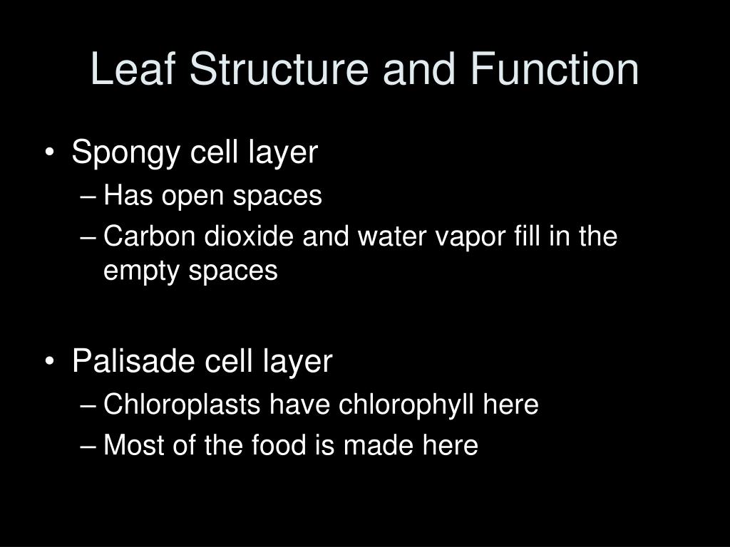 Leaf Structure and Function • Spongy cell layer • Has open spaces • Carbon dioxide and water vapor fill in the empty spaces • Palisade cell layer • Chloroplasts have chlorophyll here • Most of the food is made here