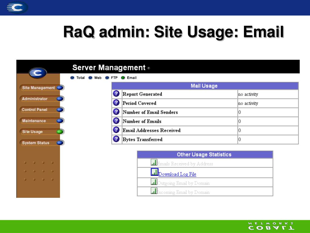 Administrative Capabilities of the RaQ 3 Administrator • All the abilities of the site administrator, plus… • “root” access • Creates and delete sites • Determine service status for web, ftp, email, shell • Manages email configuration • Creates / manages DNS • Configures bandwidth management • Suspends sites • Performs maintenance • Backup and restore • Update software • Monitoring system operation and status