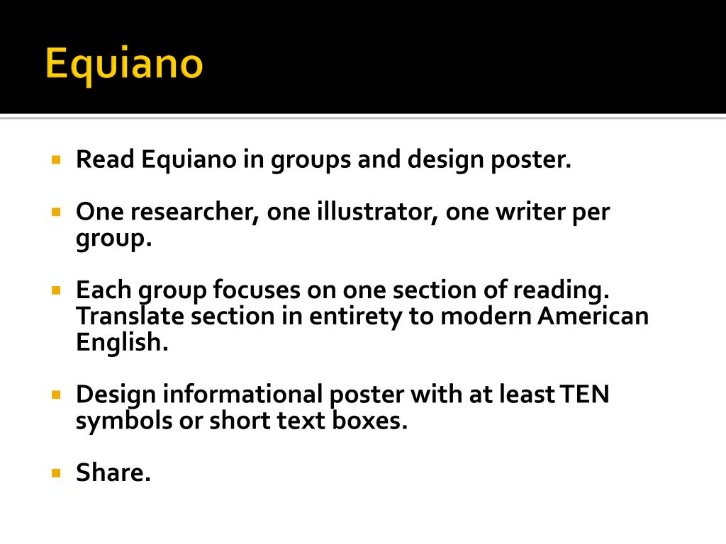 Equiano • Read Equiano in groups and design poster. • One researcher, one illustrator, one writer per group. • Each group focuses on one section of reading. Translate section in entirety to modern American English. • Design informational poster with at least TEN symbols or short text boxes. • Share.