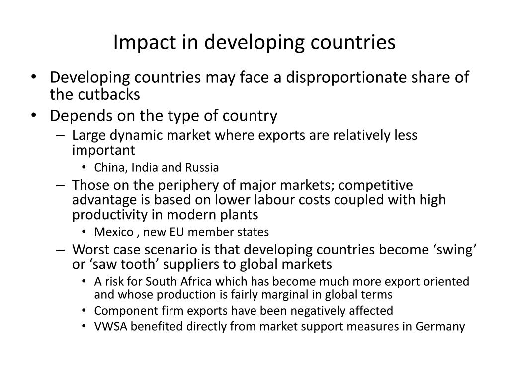 Impact in developing countries • Developing countries may face a disproportionate share of the cutbacks • Depends on the type of country • Large dynamic market where exports are relatively less important • China, India and Russia • Those on the periphery of major markets; competitive advantage is based on lower labour costs coupled with high productivity in modern plants • Mexico , new EU member states • Worst case scenario is that developing countries become ‘swing’ or ‘saw tooth’ suppliers to global markets • A risk for South Africa which has become much more export oriented and whose production is fairly marginal in global terms • Component firm exports have been negatively affected • VWSA benefited directly from market support measures in Germany