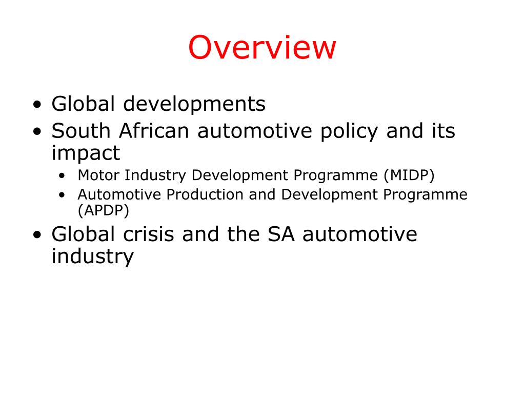 Overview • Global developments • South African automotive policy and its impact • Motor Industry Development Programme (MIDP) • Automotive Production and Development Programme (APDP) • Global crisis and the SA automotive industry