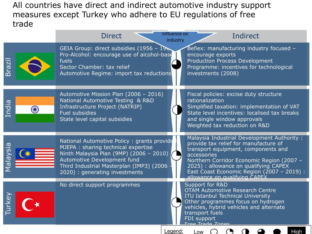 Legend: High Low GEIA Group: direct subsidies (1956 – 1961) Pro-Alcohol: encourage use of alcohol-based fuels Sector Chamber: tax relief Automotive Regime: import tax reductions Befiex: manufacturing industry focused – encourage exports Production Process Development Programme: incentives for technological investments (2008) All countries have direct and indirect automotive industry support measures except Turkey who adhere to EU regulations of free trade Direct Indirect Influence on industry Automotive Mission Plan (2006 – 2016) National Automotive Testing & R&D Infrastructure Project (NATRIP) Fuel subsidies State level capital subsidies Fiscal policies: excise duty structure rationalization Simplified taxation: implementation of VAT State level incentives: localised tax breaks and single window approvals Weighted tax reduction on R&D Brazil Malaysia Industrial Development Authority : provide tax relief for manufacture of transport equipment, components and accessories Northern Corridor Economic Region (2007 – 2025) : allowance on qualifying CAPEX East Coast Economic Region (2007 – 2019) : allowance on qualifying CAPEX National Automotive Policy : grants provided MJEPA : sharing technical expertise Ninth Malaysia Plan (9MP) (2006 – 2010) : Automotive Development fund Third Industrial Masterplan (IMP3) (2006 – 2020) : generating investments India No direct support programmes Support for R&D OTAM Automotive Research Centre ITU Istanbul Technical University Other programmes focus on hydrogen vehicles, hybrid vehicles and alternate transport fuels FDI support Free Trade Zones Malaysia Turkey
