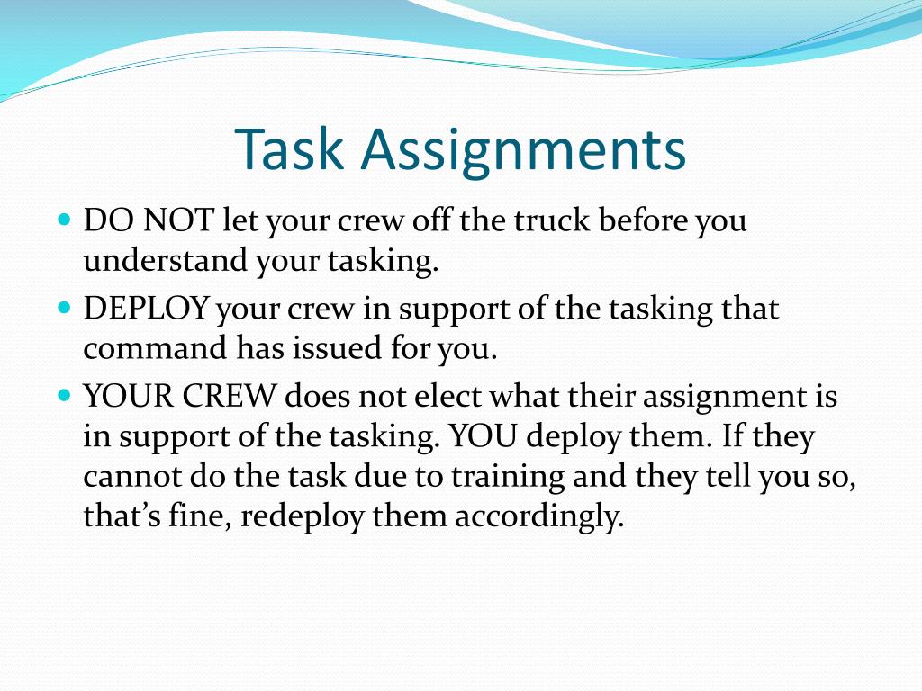 Task Assignments • DO NOT let your crew off the truck before you understand your tasking. • DEPLOY your crew in support of the tasking that command has issued for you. • YOUR CREW does not elect what their assignment is in support of the tasking. YOU deploy them. If they cannot do the task due to training and they tell you so, that’s fine, redeploy them accordingly.