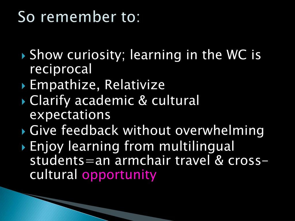 So remember to: • Show curiosity; learning in the WC is reciprocal • Empathize, Relativize • Clarify academic & cultural expectations • Give feedback without overwhelming • Enjoy learning from multilingual students=an armchair travel & cross-cultural opportunity