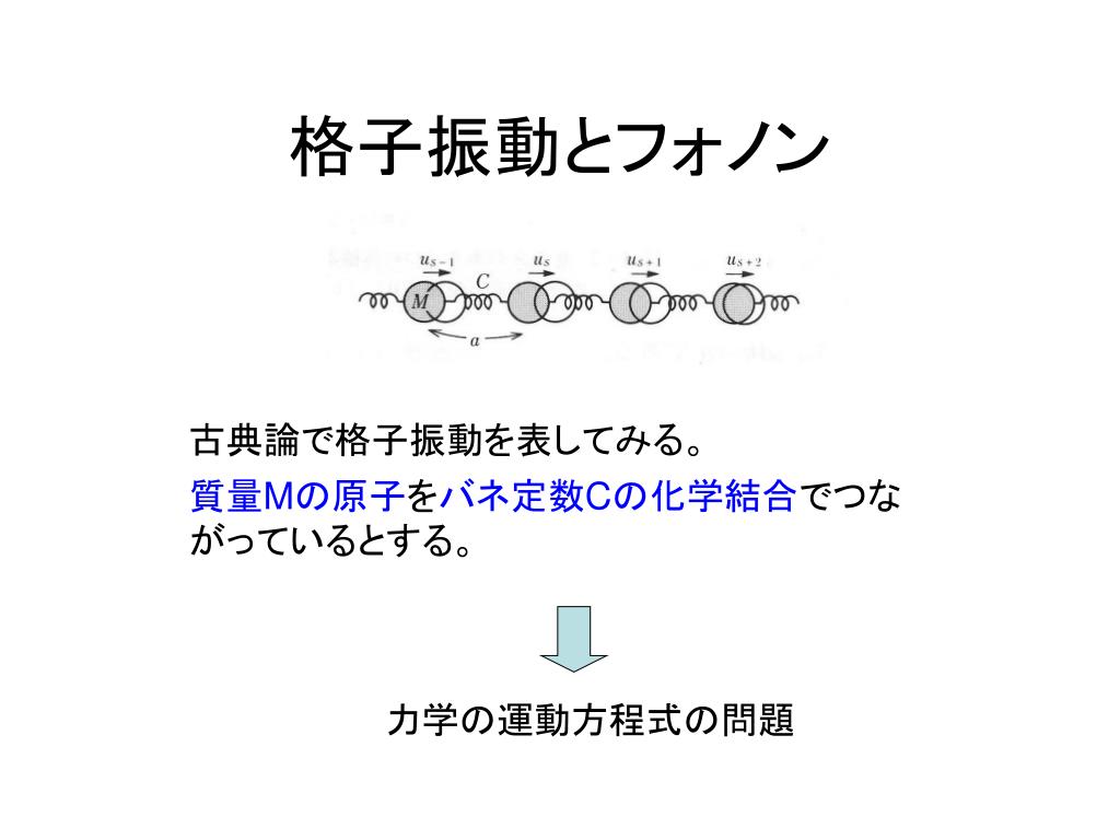 格子振動とフォノン 古典論で格子振動を表してみる。 質量Mの原子をバネ定数Cの化学結合でつながっているとする。 力学の運動方程式の問題