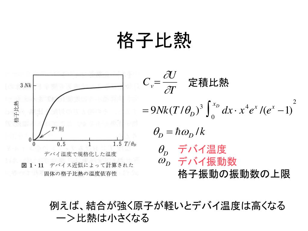 格子比熱 定積比熱 デバイ温度 デバイ振動数 格子振動の振動数の上限 例えば、結合が強く原子が軽いとデバイ温度は高くなる ー>比熱は小さくなる