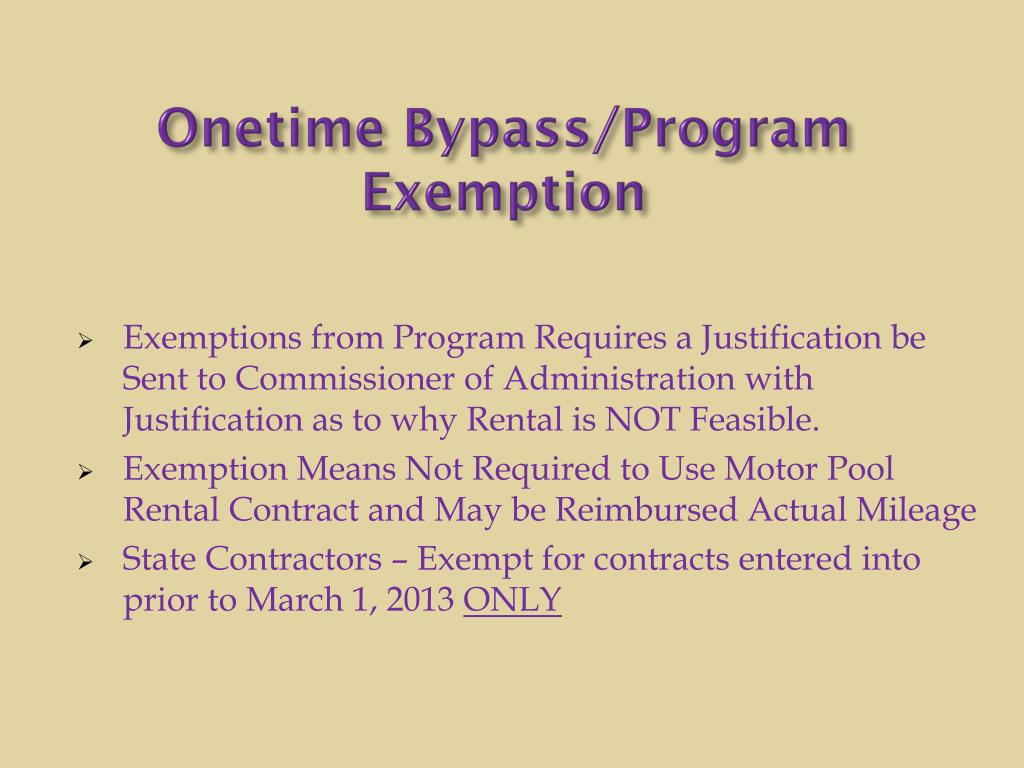 Onetime Bypass/Program Exemption • Exemptions from Program Requires a Justification be Sent to Commissioner of Administration with Justification as to why Rental is NOT Feasible. • Exemption Means Not Required to Use Motor Pool Rental Contract and May be Reimbursed Actual Mileage • State Contractors – Exempt for contracts entered into prior to March 1, 2013 ONLY