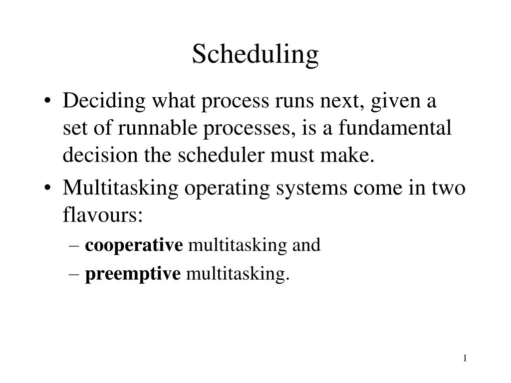 Scheduling. Deciding what process runs next, given a set of runnable processes, is a fundamental decision the scheduler must make. Multitasking operating systems come in two flavours: cooperative multitasking and preemptive multitasking.