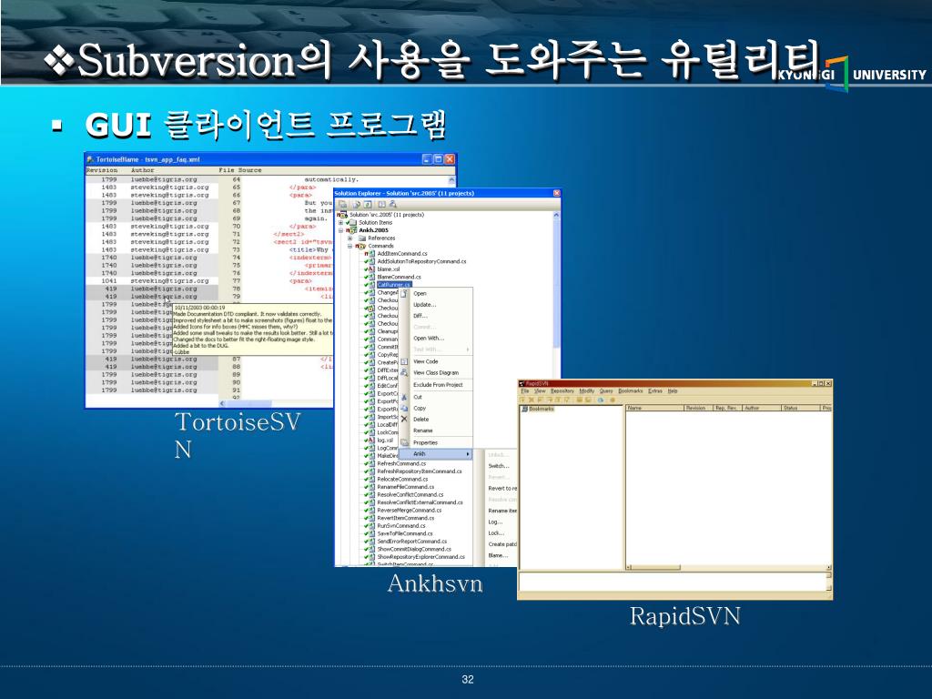 Subversion의 사용을 도와주는 유틸리티 • GUI 클라이언트 프로그램 TortoiseSVN Ankhsvn RapidSVN