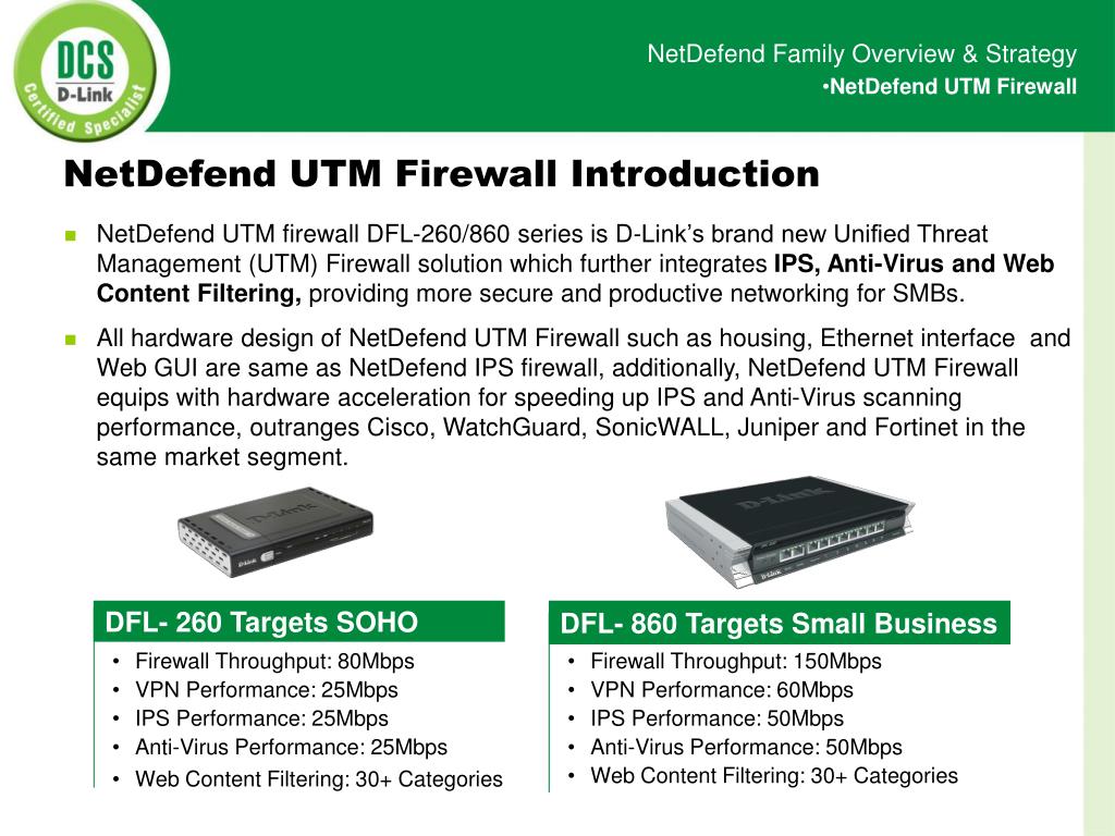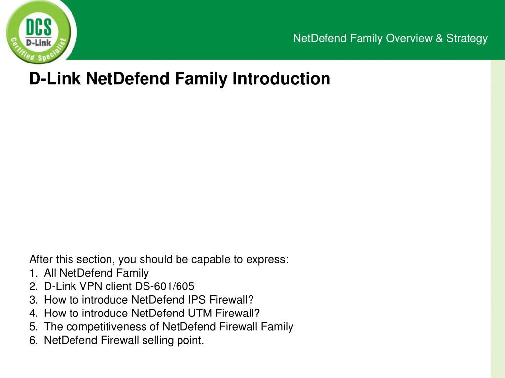 D-Link NetDefend Family Introduction NetDefend Family Overview & Strategy After this section, you should be capable to express: All NetDefend Family D-Link VPN client DS-601/605 How to introduce NetDefend IPS Firewall? How to introduce NetDefend UTM Firewall? The competitiveness of NetDefend Firewall Family NetDefend Firewall selling point.