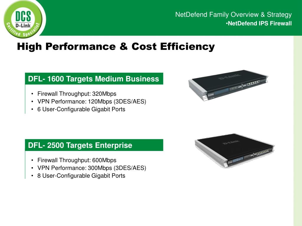 NetDefend Family Overview & Strategy NetDefend IPS Firewall High Performance & Cost Efficiency DFL- 1600 Targets Medium Business • Firewall Throughput: 320Mbps • VPN Performance: 120Mbps (3DES/AES) • 6 User-Configurable Gigabit Ports DFL- 2500 Targets Enterprise • Firewall Throughput: 600Mbps • VPN Performance: 300Mbps (3DES/AES) • 8 User-Configurable Gigabit Ports