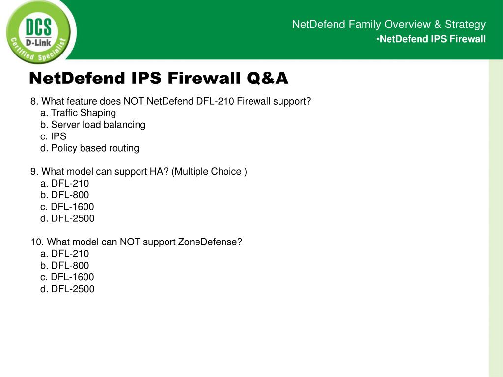 NetDefend Family Overview & Strategy NetDefend IPS Firewall NetDefend IPS Firewall Q&A 8. What feature does NOT NetDefend DFL-210 Firewall support? a. Traffic Shaping b. Server load balancing c. IPS d. Policy based routing 9. What model can support HA? (Multiple Choice ) a. DFL-210 b. DFL-800 c. DFL-1600 d. DFL-2500 10. What model can NOT support ZoneDefense? a. DFL-210 b. DFL-800 c. DFL-1600 d. DFL-2500