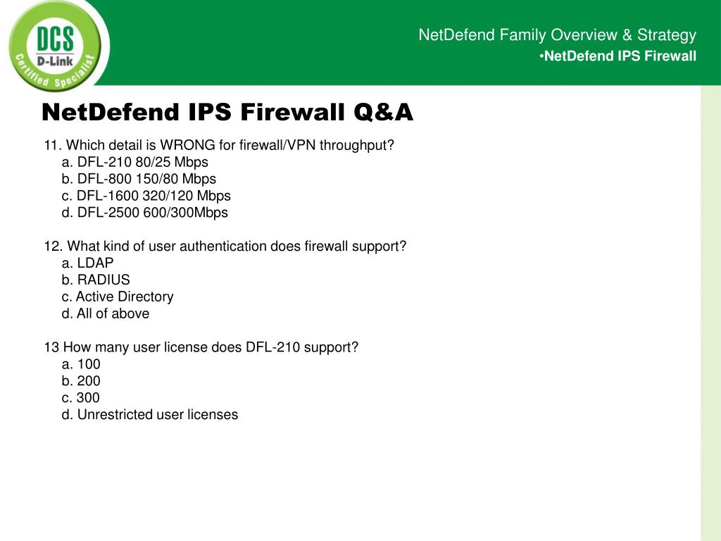 NetDefend Family Overview & Strategy NetDefend IPS Firewall NetDefend IPS Firewall Q&A 11. Which detail is WRONG for firewall/VPN throughput? a. DFL-210 80/25 Mbps b. DFL-800 150/80 Mbps c. DFL-1600 320/120 Mbps d. DFL-2500 600/300Mbps 12. What kind of user authentication does firewall support? a. LDAP b. RADIUS c. Active Directory d. All of above 13 How many user license does DFL-210 support? a. 100 b. 200 c. 300 d. Unrestricted user licenses