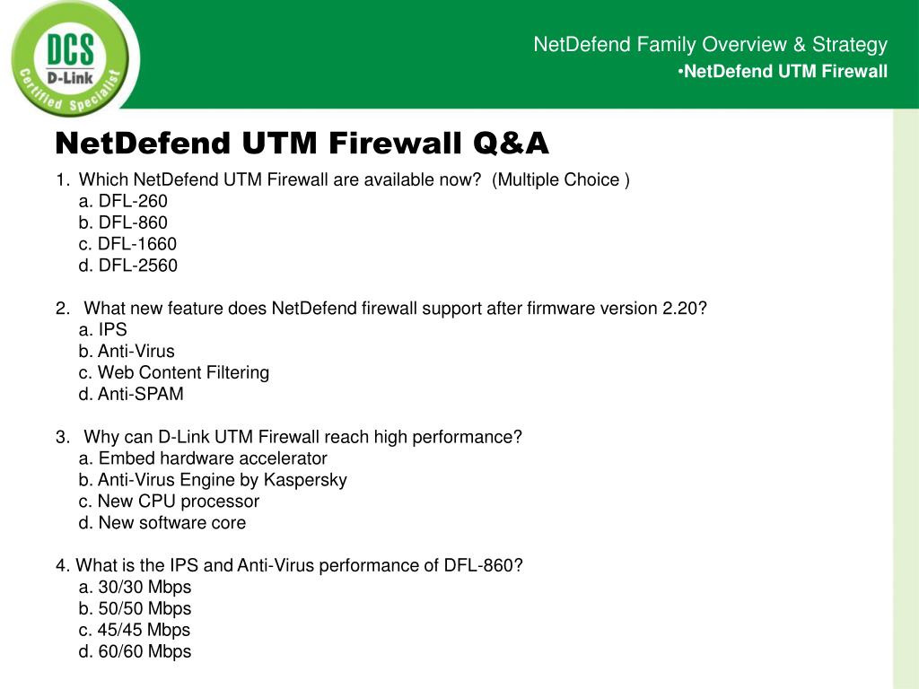 NetDefend Family Overview & Strategy NetDefend UTM Firewall NetDefend UTM Firewall Q&A • Which NetDefend UTM Firewall are available now? (Multiple Choice ) • a. DFL-260 • b. DFL-860 • c. DFL-1660 • d. DFL-2560 • What new feature does NetDefend firewall support after firmware version 2.20? • a. IPS • b. Anti-Virus • c. Web Content Filtering • d. Anti-SPAM • Why can D-Link UTM Firewall reach high performance? • a. Embed hardware accelerator • b. Anti-Virus Engine by Kaspersky • c. New CPU processor • d. New software core • 4. What is the IPS and Anti-Virus performance of DFL-860? • a. 30/30 Mbps • b. 50/50 Mbps • c. 45/45 Mbps • d. 60/60 Mbps