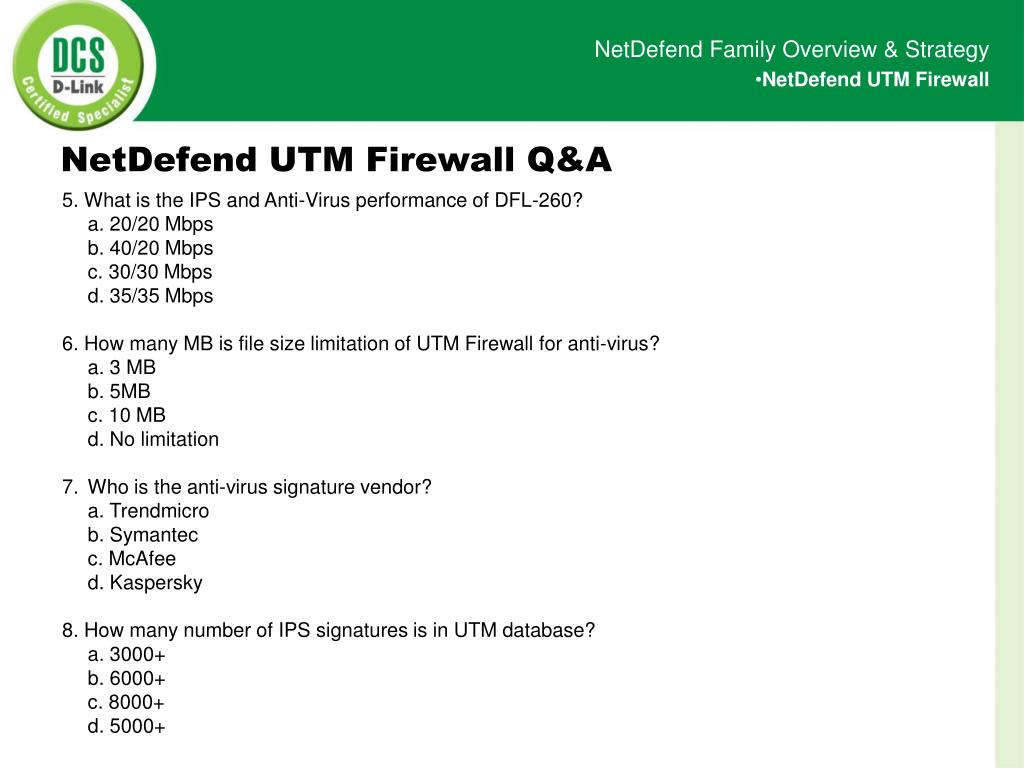 NetDefend Family Overview & Strategy NetDefend UTM Firewall NetDefend UTM Firewall Q&A 5. What is the IPS and Anti-Virus performance of DFL-260? a. 20/20 Mbps b. 40/20 Mbps c. 30/30 Mbps d. 35/35 Mbps 6. How many MB is file size limitation of UTM Firewall for anti-virus? a. 3 MB b. 5MB c. 10 MB d. No limitation 7. Who is the anti-virus signature vendor? a. Trendmicro b. Symantec c. McAfee d. Kaspersky 8. How many number of IPS signatures is in UTM database? a. 3000+ b. 6000+ c. 8000+ d. 5000+