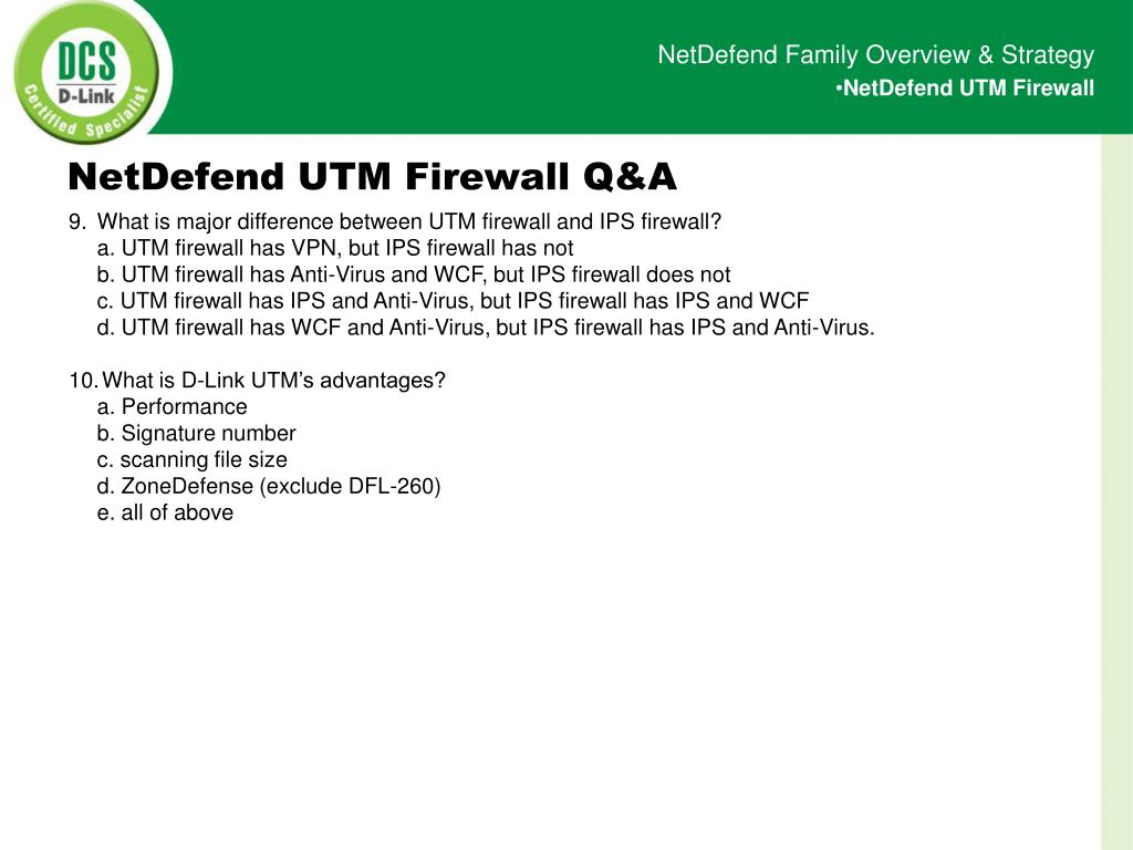 NetDefend Family Overview & Strategy NetDefend UTM Firewall NetDefend UTM Firewall Q&A 9. What is major difference between UTM firewall and IPS firewall? a. UTM firewall has VPN, but IPS firewall has not b. UTM firewall has Anti-Virus and WCF, but IPS firewall does not c. UTM firewall has IPS and Anti-Virus, but IPS firewall has IPS and WCF d. UTM firewall has WCF and Anti-Virus, but IPS firewall has IPS and Anti-Virus. 10. What is D-Link UTM’s advantages? a. Performance b. Signature number c. scanning file size d. ZoneDefense (exclude DFL-260) e. all of above