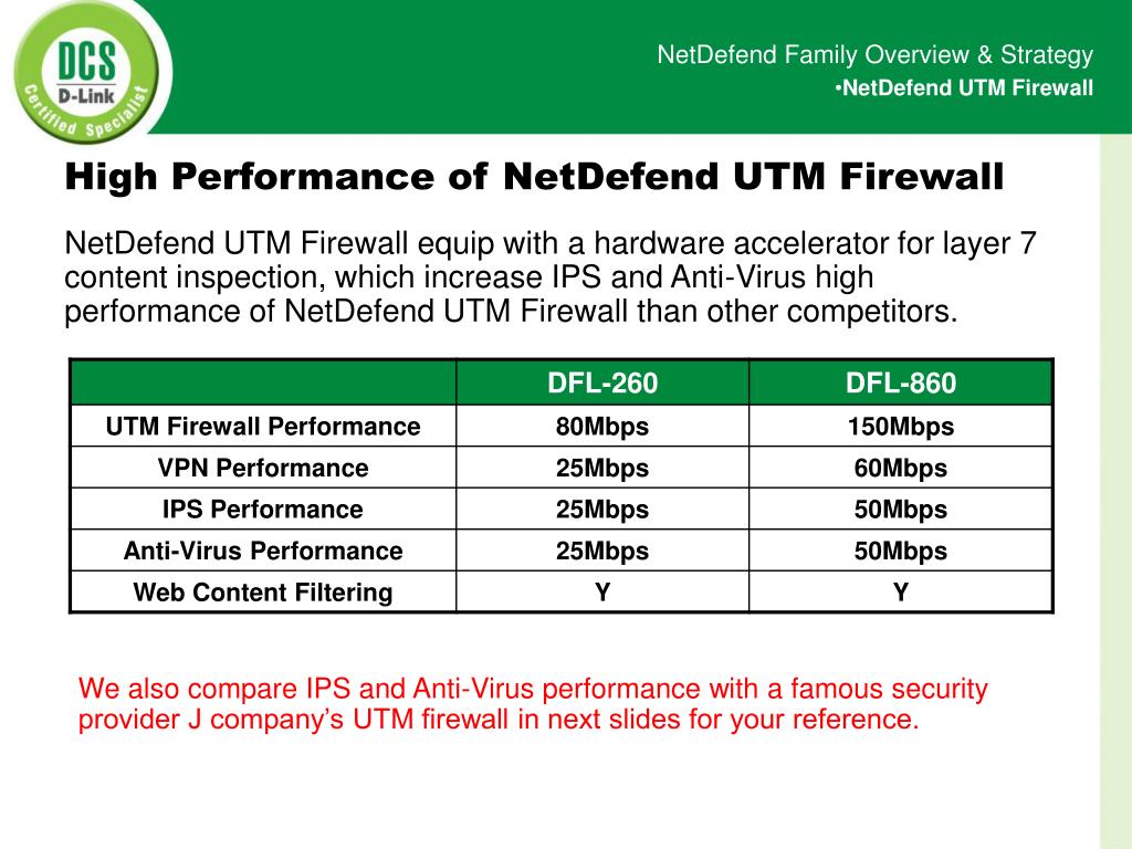 NetDefend Family Overview & Strategy NetDefend UTM Firewall High Performance of NetDefend UTM Firewall NetDefend UTM Firewall equip with a hardware accelerator for layer 7 content inspection, which increase IPS and Anti-Virus high performance of NetDefend UTM Firewall than other competitors. We also compare IPS and Anti-Virus performance with a famous security provider J company’s UTM firewall in next slides for your reference.